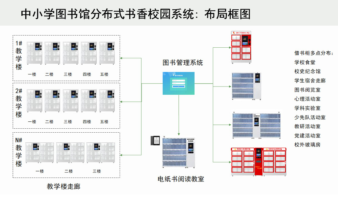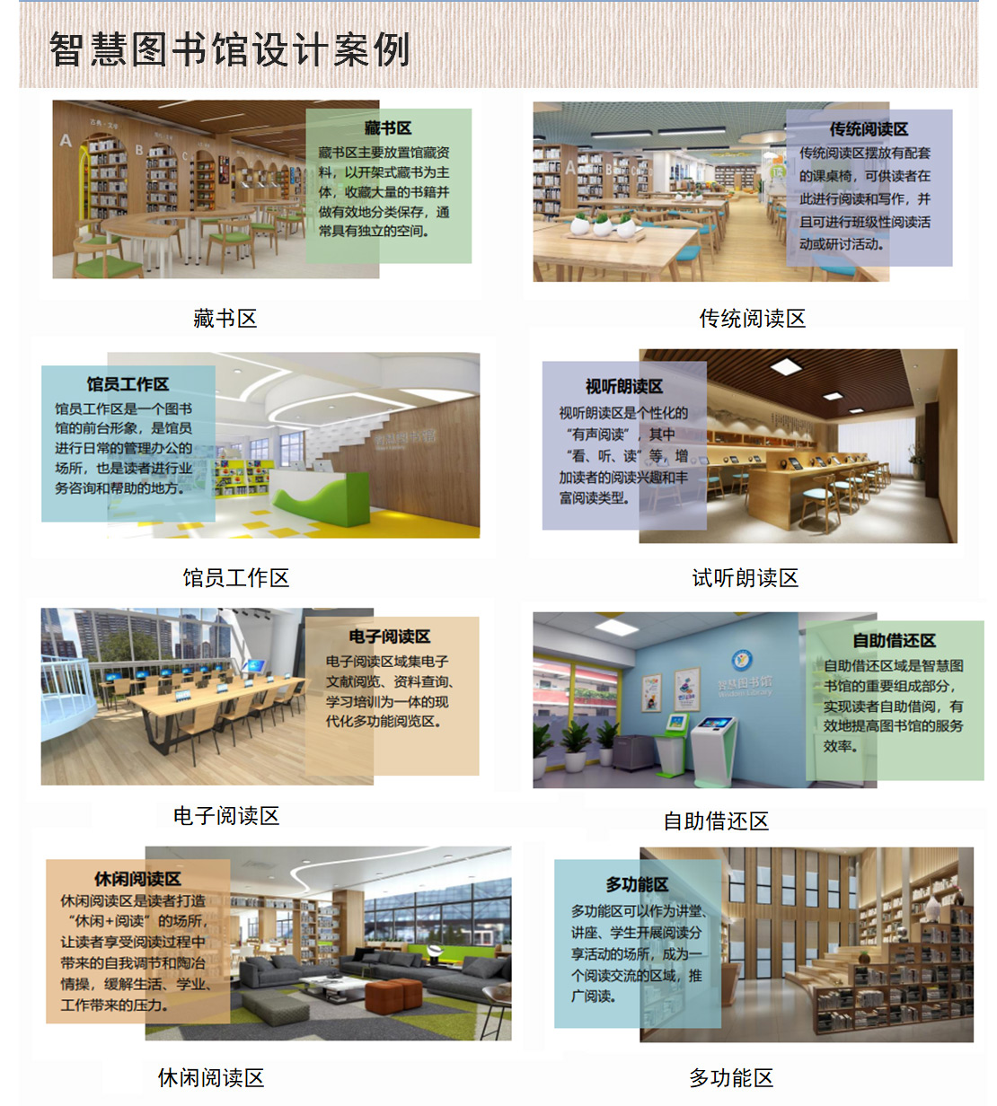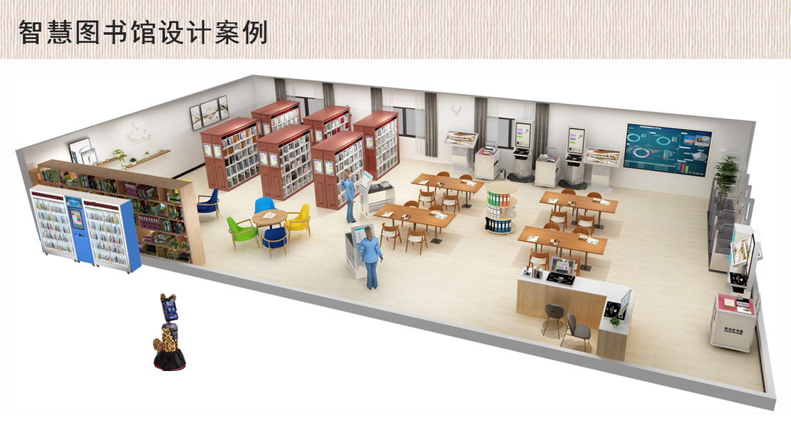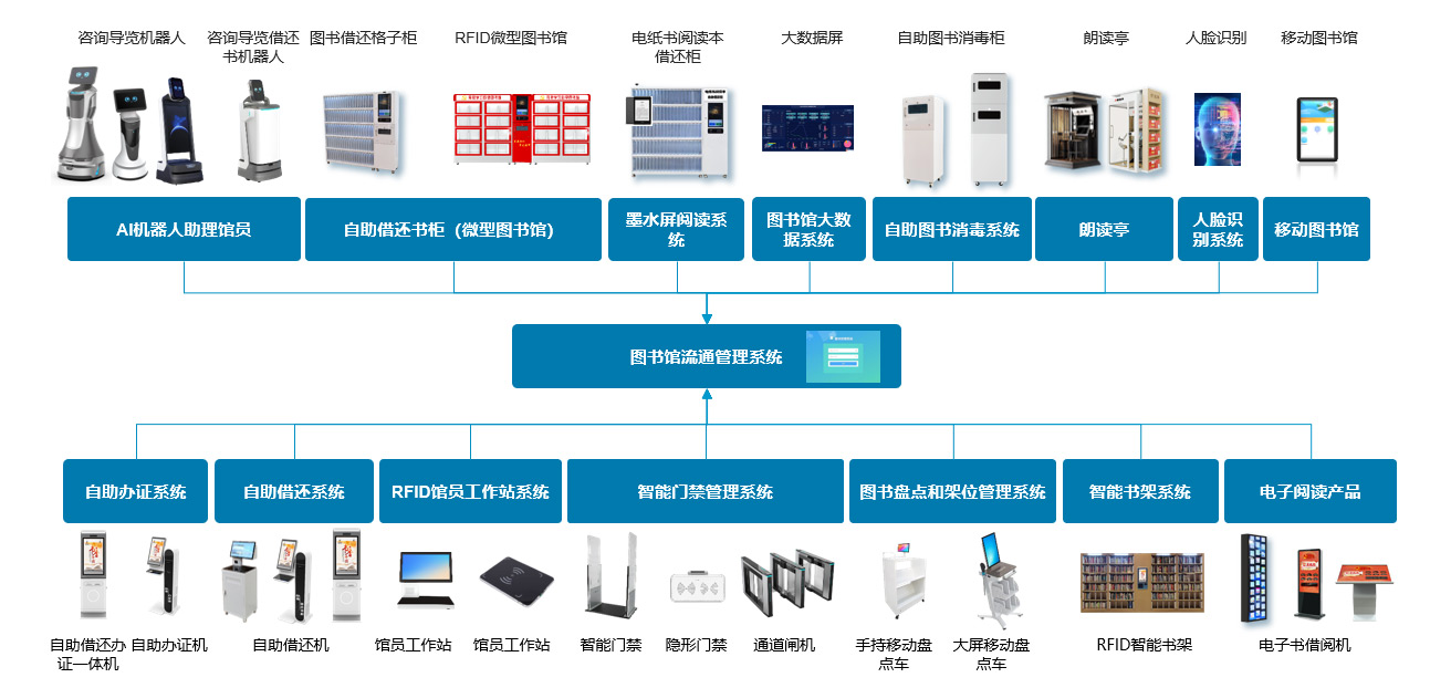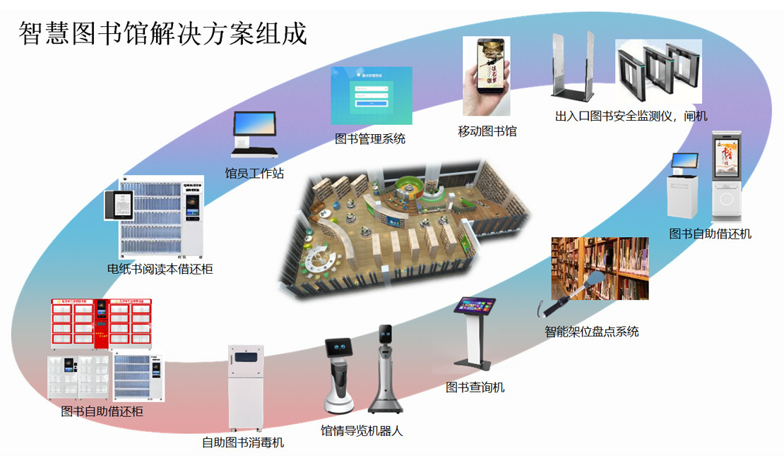 由館情導(dǎo)覽機(jī)器人、圖書查詢機(jī)、智能架位盤點(diǎn)系統(tǒng)、圖書自助借還機(jī)、出入口圖書安全監(jiān)測(cè)儀,閘機(jī)、移動(dòng)圖書館、圖書管理系統(tǒng)、館員工作站、電紙書閱讀本借還柜、圖書自助借還柜、自助圖書消毒機(jī)等設(shè)備及系統(tǒng)組成。