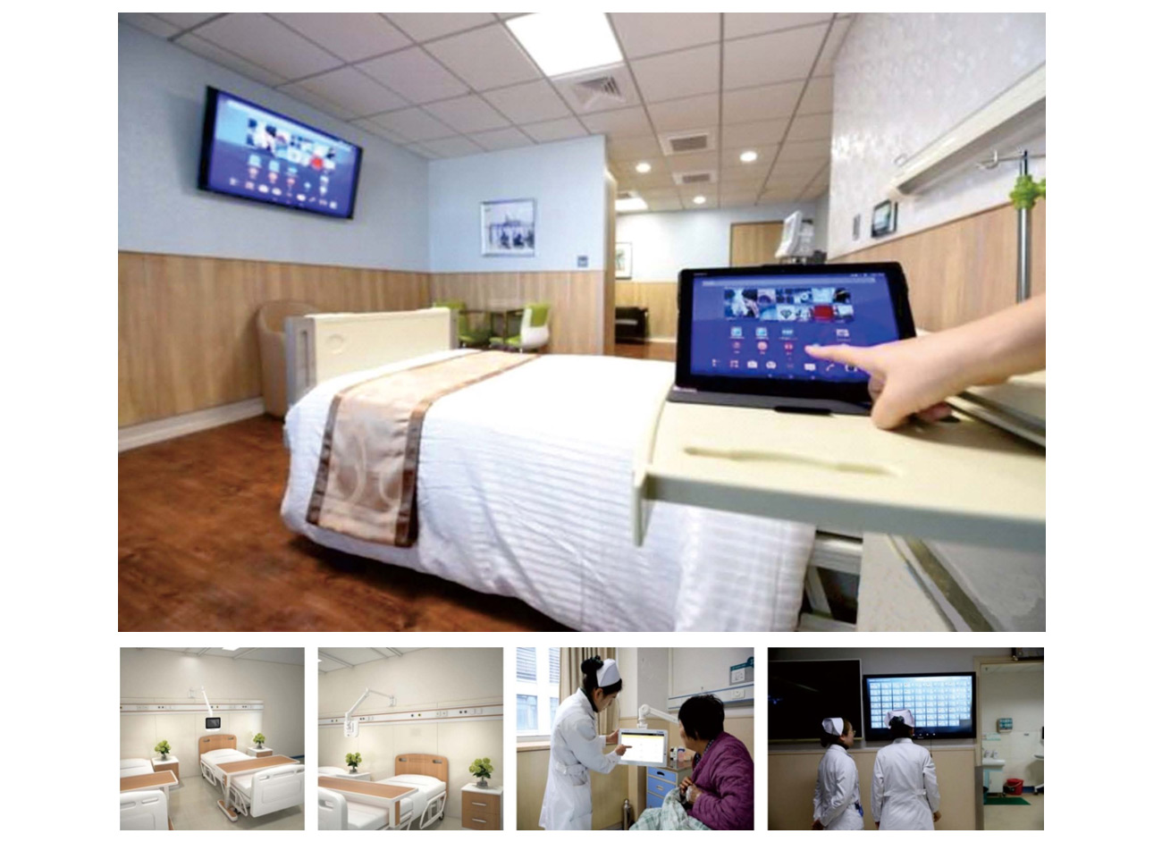 通過物聯(lián)網(wǎng)將智能門鎖(通過指紋或人臉識別)、智能床頭柜、智能音箱、智能電視、智能窗簾、智能燈、智能溫濕度監(jiān)控的應(yīng)用在病房中。